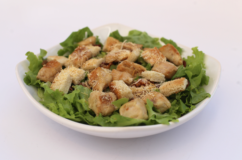 Pollo, lechuga crespa, croutones, tocino, aderezo cesar y queso parmesano