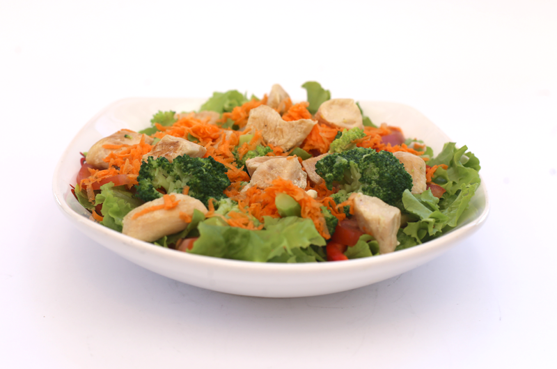 Pollo, lomo o mixto, lechuga crespa, pimiento morrón, tomate, zanahoria, brócoli, aderezo vinagreta