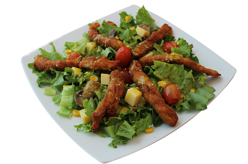 Lechuga crespa, tomate cherry, champiñones, maíz dulce, queso holandés, pollo apanado en tiras, ajonjolí en aderezo mostaza y miel.