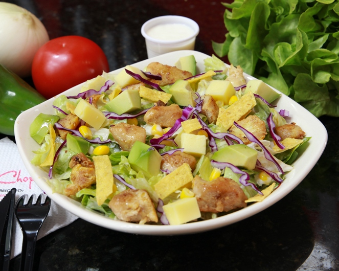 Pollo, queso, aguacate, choclo, nachos, mix de lechuga, aderezo primavera